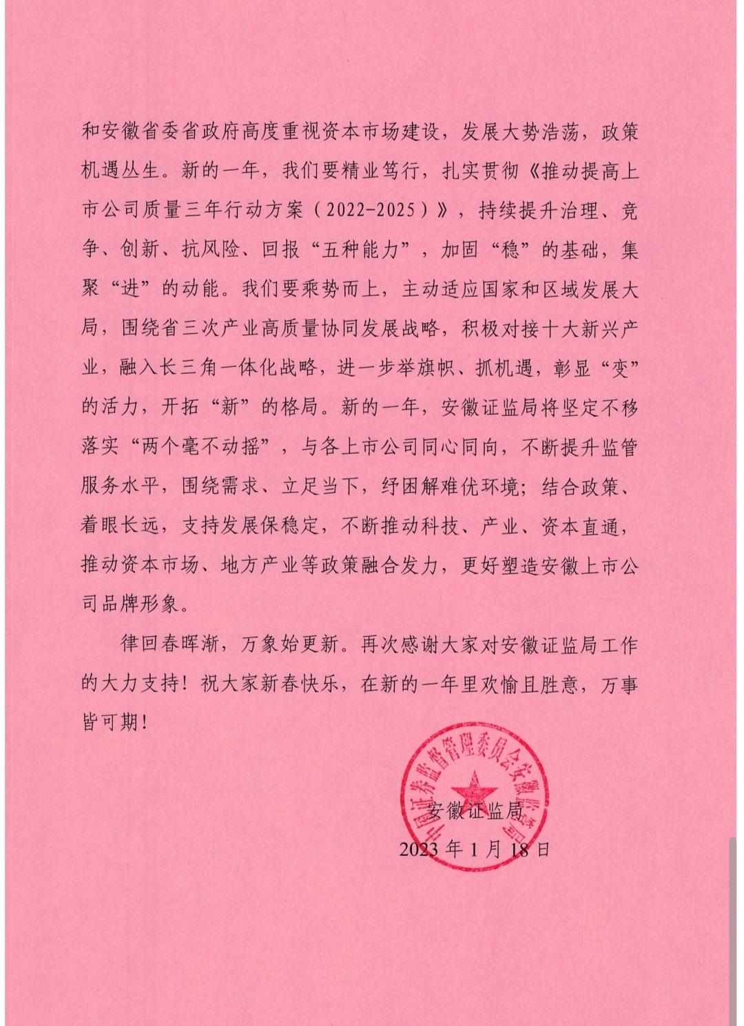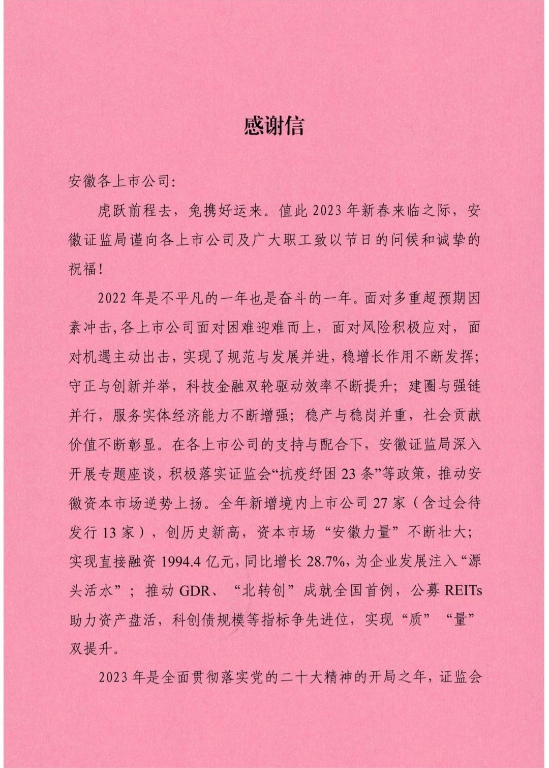 《感谢信》来自安徽证监局。“在2023年新春来临之际,YY易游体育向辖区各上市公司寄送《感谢信》,送去节日的问候和祝福。”安徽证监局有关负责人表示,2022年是不平凡的一年也是奋斗的一年。面对多重超预期因素冲击,各上市公司面对困难迎难而上,面对风险积极应对,面对机遇主动出击,实现了规范与发展并进,稳增长作用不断发挥;守正与创新并举,科技金融双轮驱动效率不断提升;建圈与强链并行,服务实体经济能力不断增强;稳产与稳岗并重,社会贡献价值不断彰显。