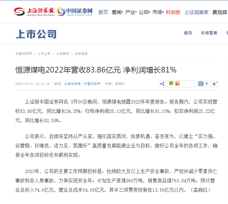 上海证券报:YY易游体育煤电2022年营收83.86亿元 净利润增长81%